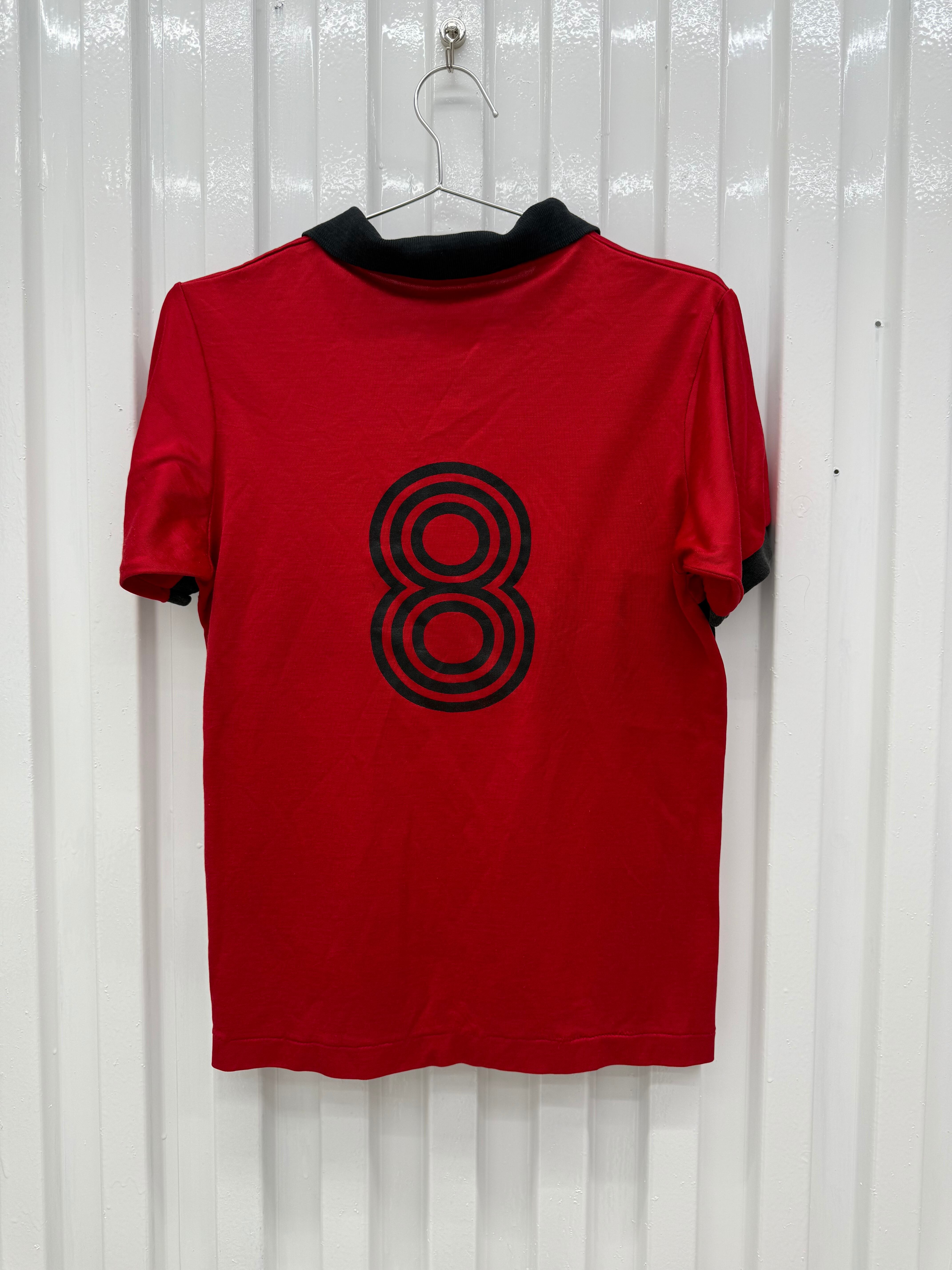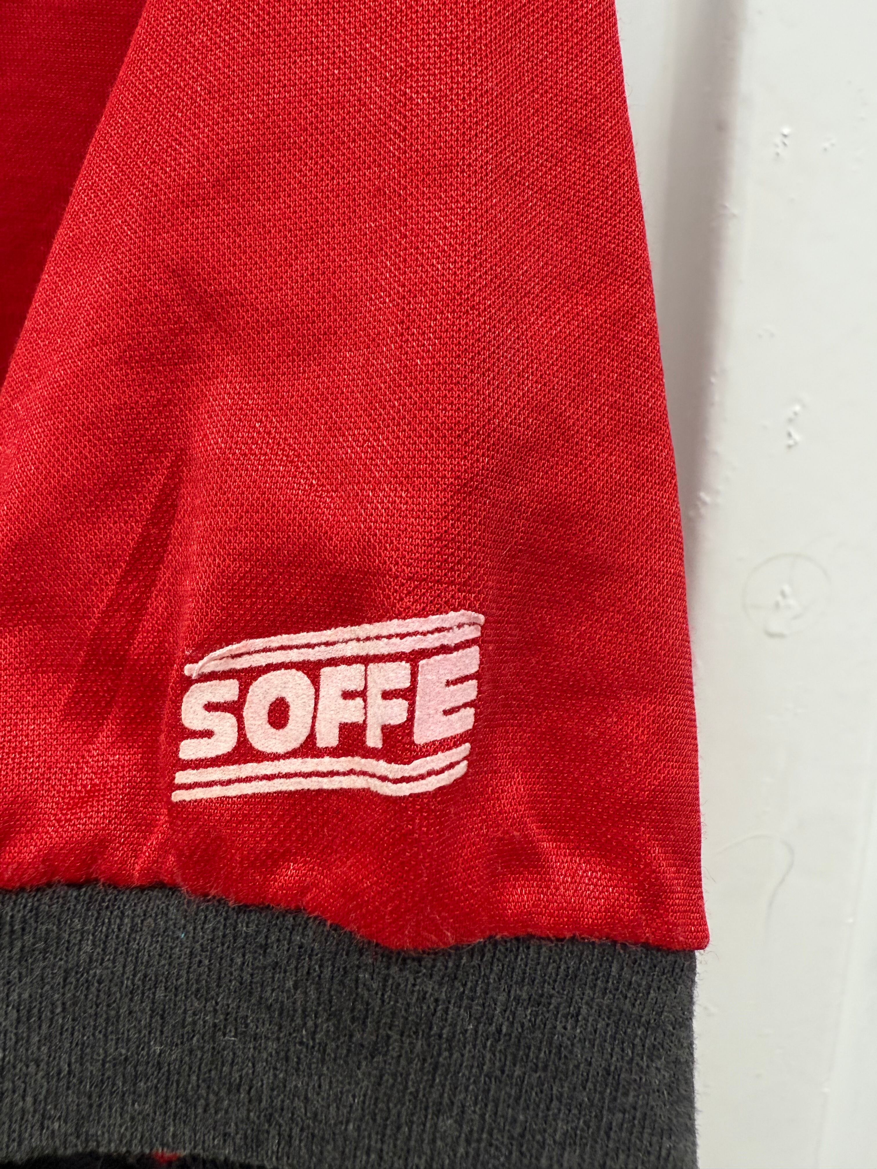 Vネック×ポロ襟、赤×黒のコントラスト、袖にさりげなく入るSOFFEロゴ、背中のナンバリング