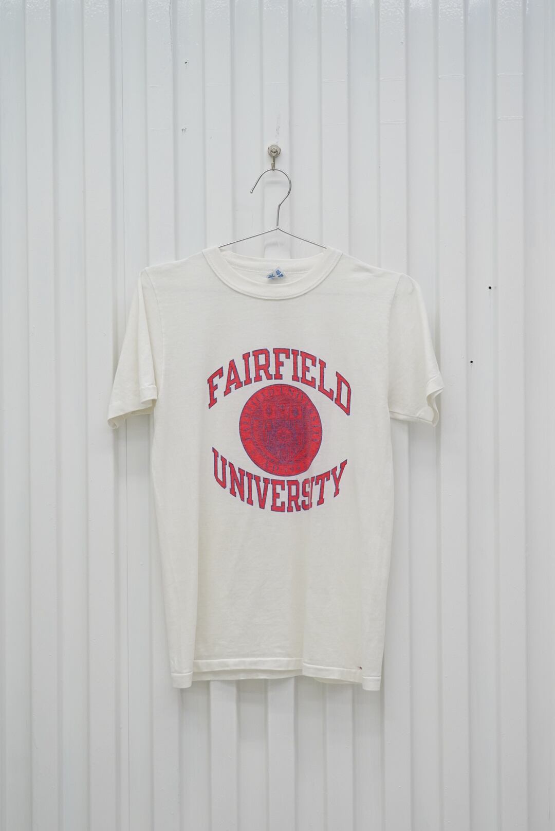 FAIRFIELD UNIVERSITY(フェアフィールド大学)のアーチロゴと校章が染み込みプリントで施された、雰囲気抜群の一枚です。