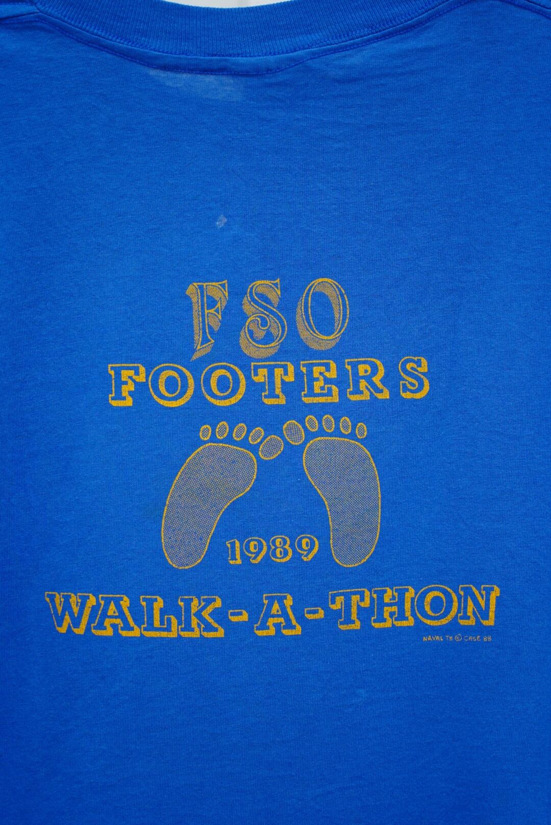 1989年に開催されたチャリティーウォーキングイベント「FSO FOOTERS WALK-A-THON」のプロモTシャツ。フロントはロゴと足跡モチーフ、バックには大胆に1989年の年号入りグラフィックが配された両面プリント仕様。