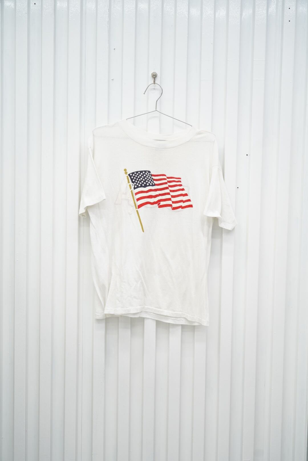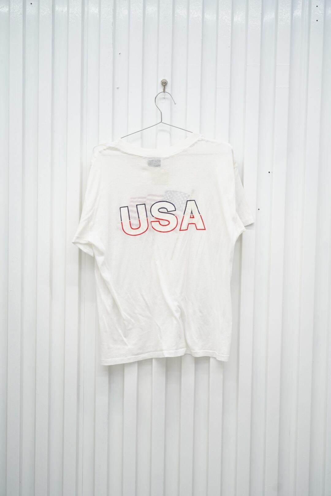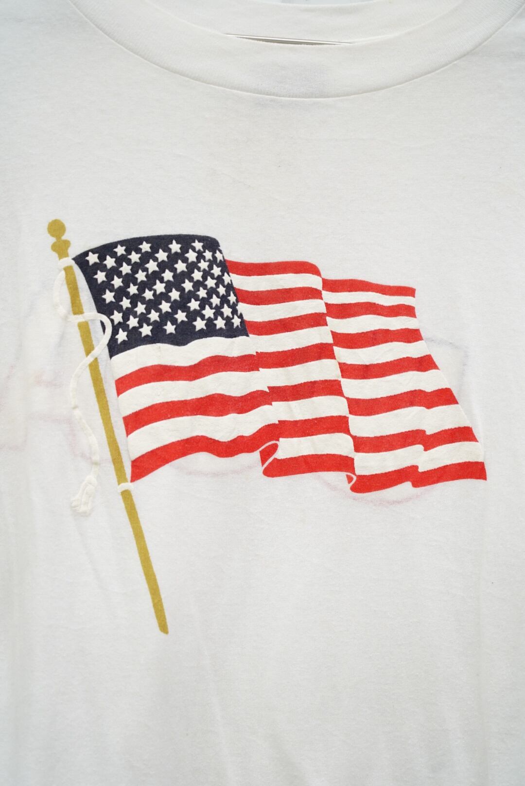 星条旗がたなびくアメリカらしいグラフィックに、背面には「USA」ロゴが入った両面プリントTシャツ。