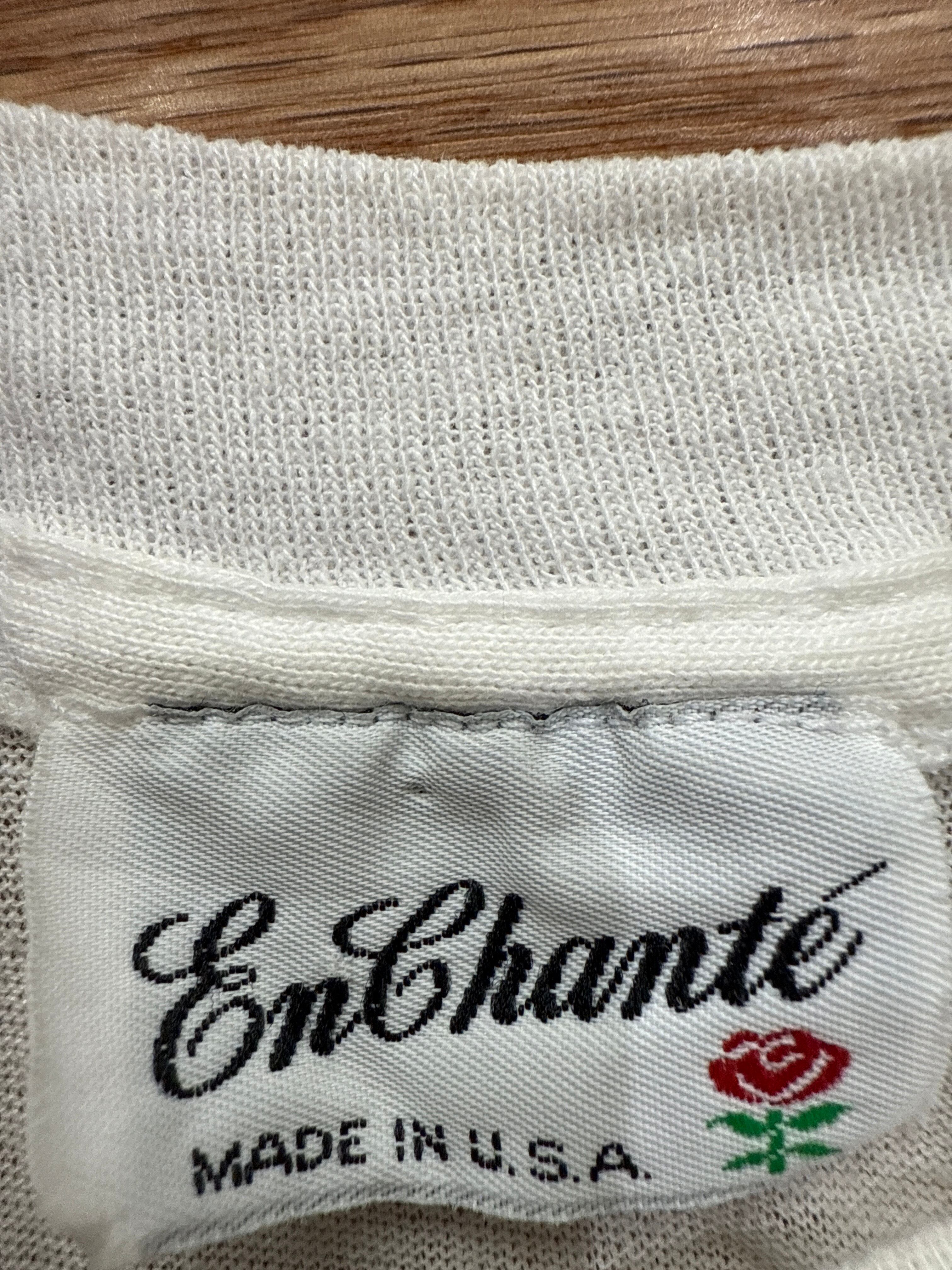 ボディはUSA製のEnChanté。軽やかな質感のコットン生地で、やや透け感のある薄手タイプ。サイズはややゆったりめのL相当。シンプルながらもアイコニックなグラフィックは、夏の主役Tにもインナー使いにもぴったり。