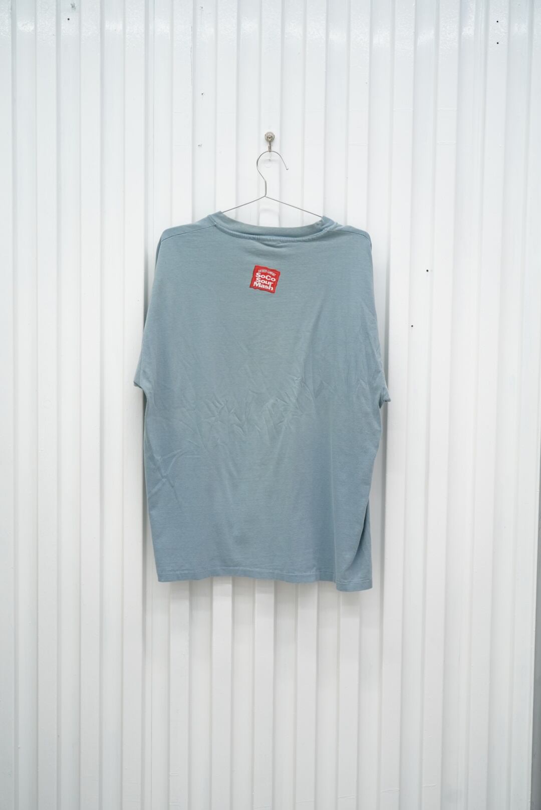 色褪せたスモーキーブルーのボディに、フェード感のあるホワイト×レッドのタイポが映える1枚。