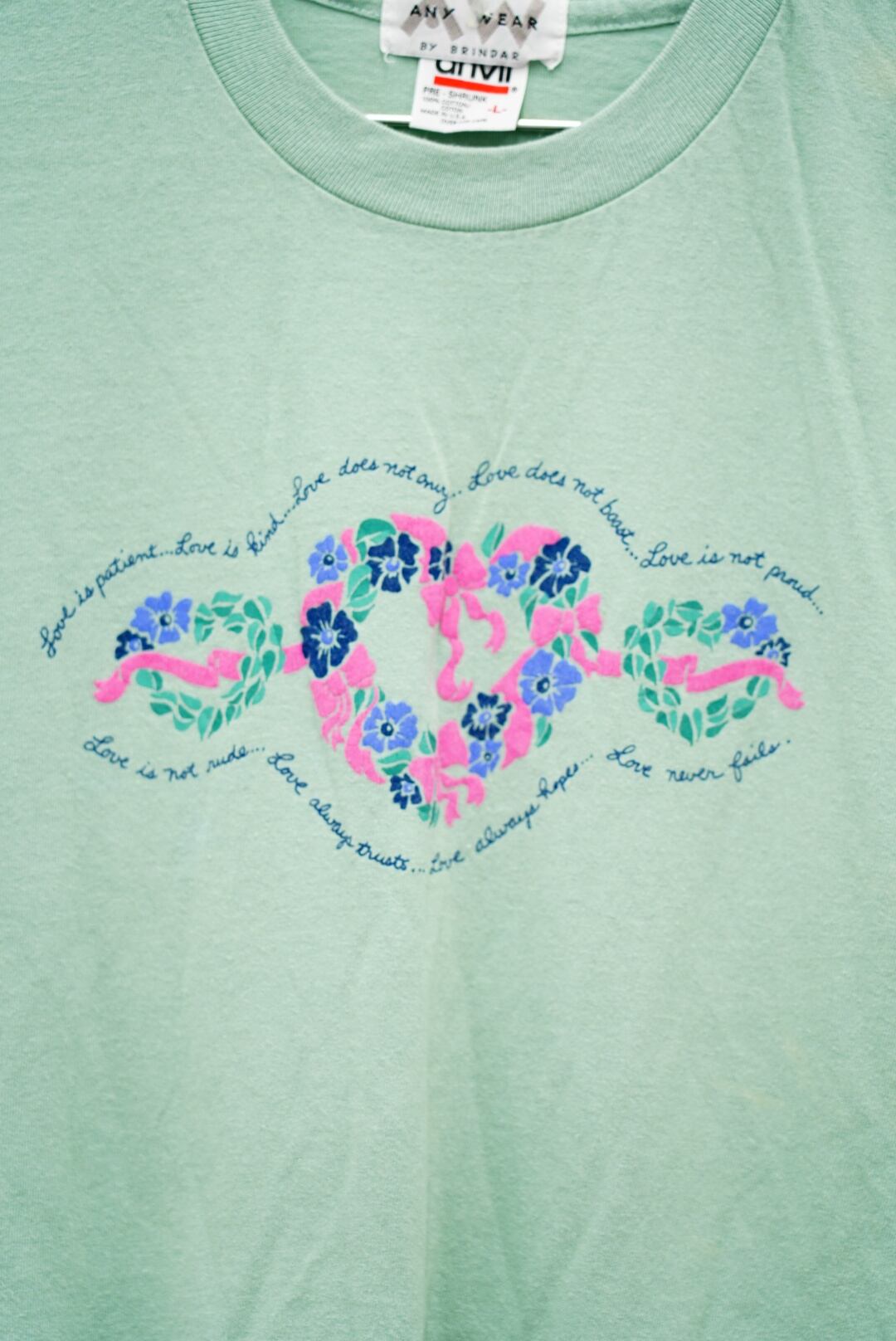 聖書の有名な一節(コリント人への手紙)を、フローラルなハートのモチーフにのせて描いた90年代のメッセージTシャツ。