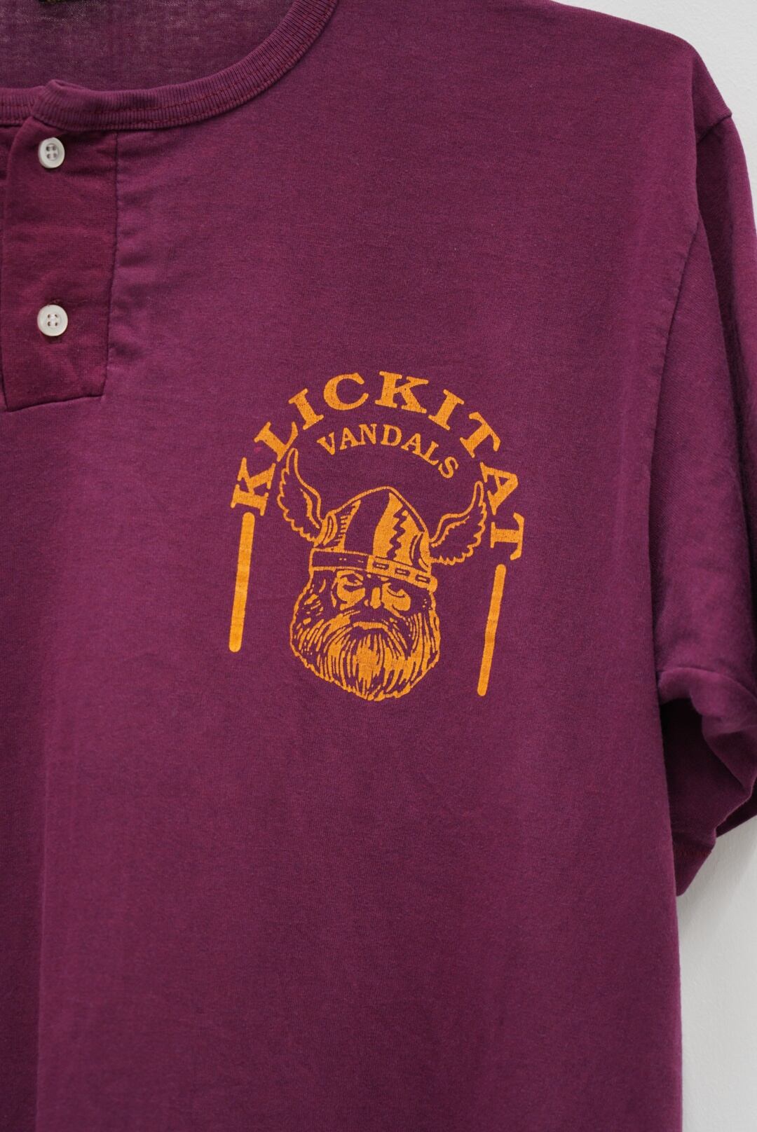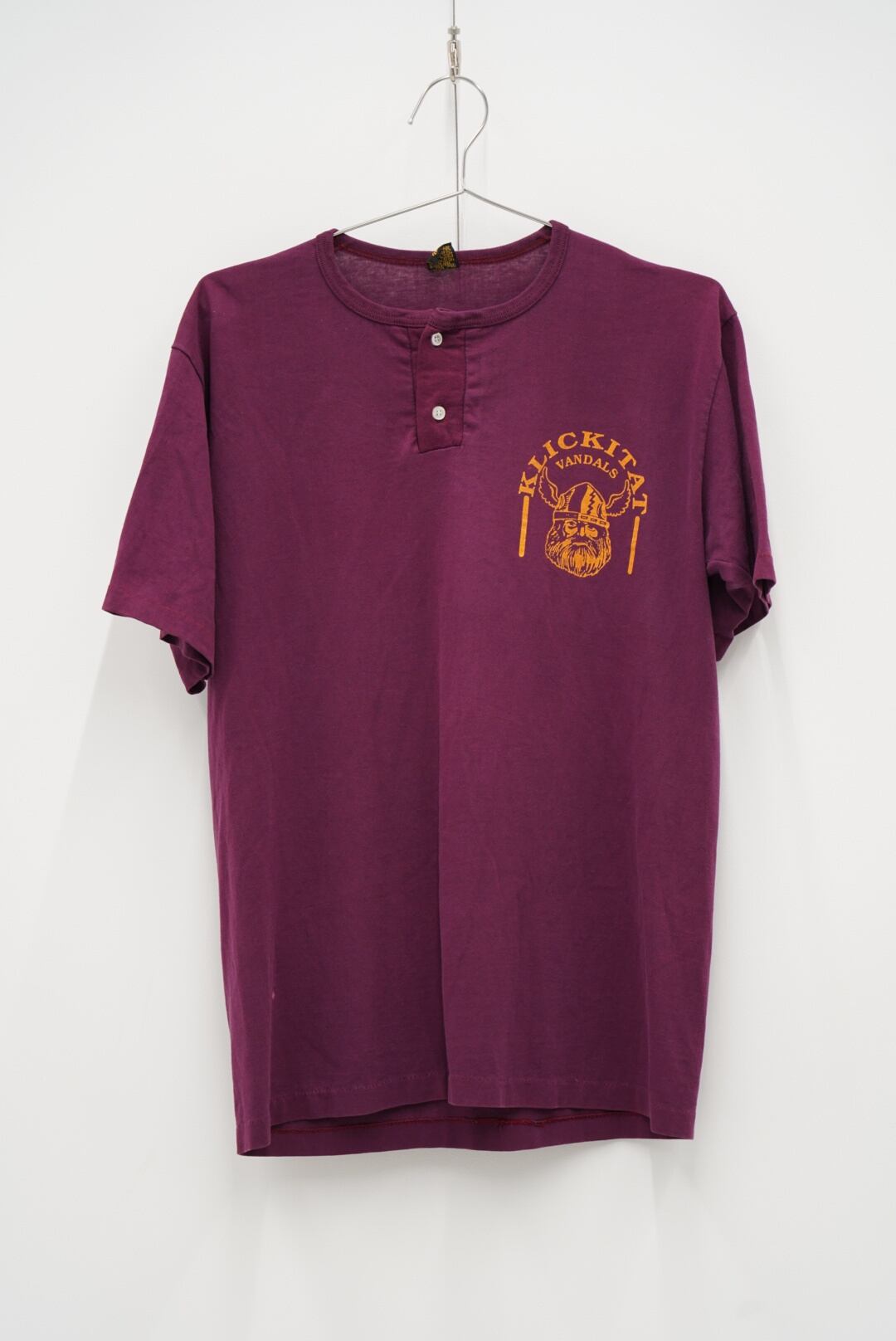 パープルボディに映えるバイキングヘッド。「KLICKITAT VANDALS」のローカル感と、ヘンリーネックの個性派シルエットがツボな一枚。アメカジとカレッジの隙間にある、ちょっと外しの効いたセレクトをお探しのあなたに。