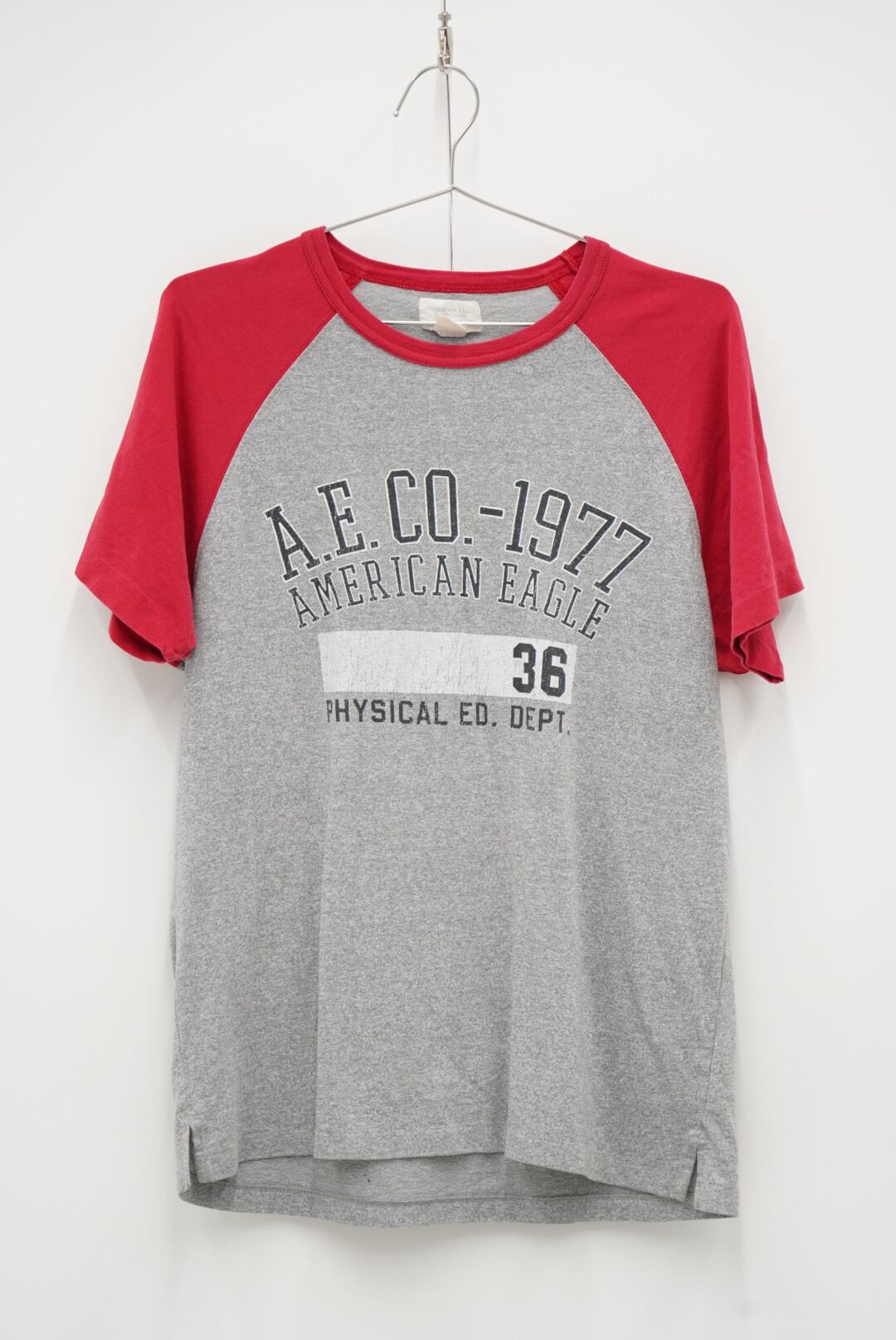 A.E.CO-1977、アメリカン・イーグルのロゴとナンバリングが映えるカレッジ風ラグランT。スポーツミックスの王道配色・レッド×グレーのコンビが爽やか。軽やかに着られる一枚です。